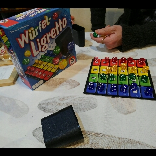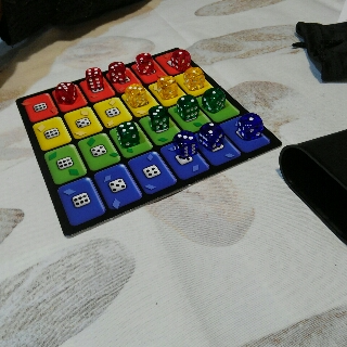 誰かが自分のダイスを置ききりましたら、他プレイヤーはダイスを置けなくなり空きマスの数が得点になります。ダイス力を上回るダイス配置の速さを競うゲームです。