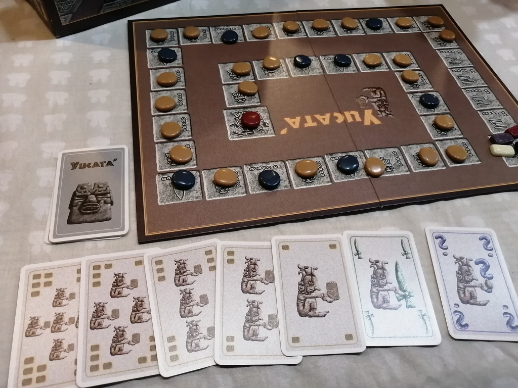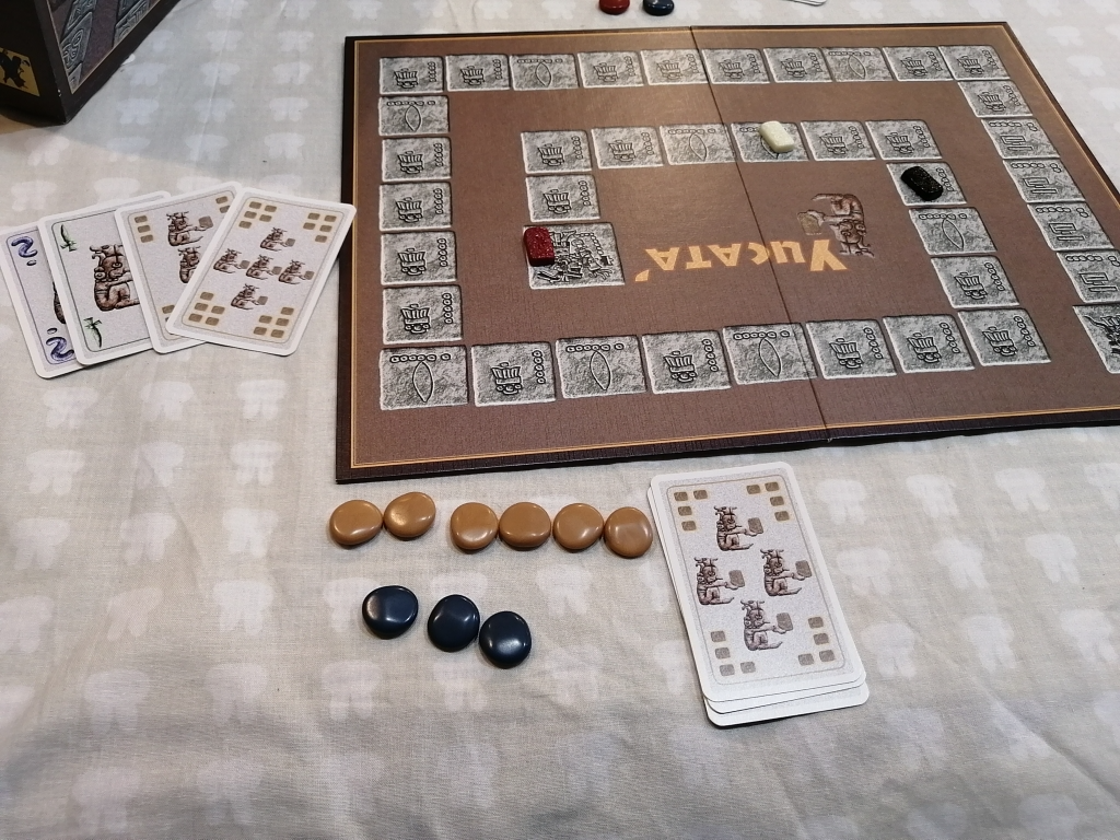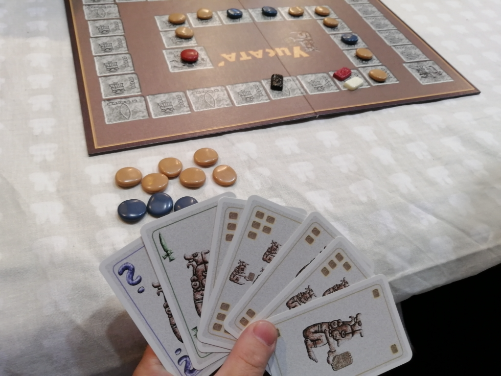 レースゲーム?になるのかな。同じ内容の手札を各プレイヤーは所持して順番にカードをプレイして、カードに書かれた数だけコマを進める。進めた際に石のあるマスを通過する、止まると石を獲得します。