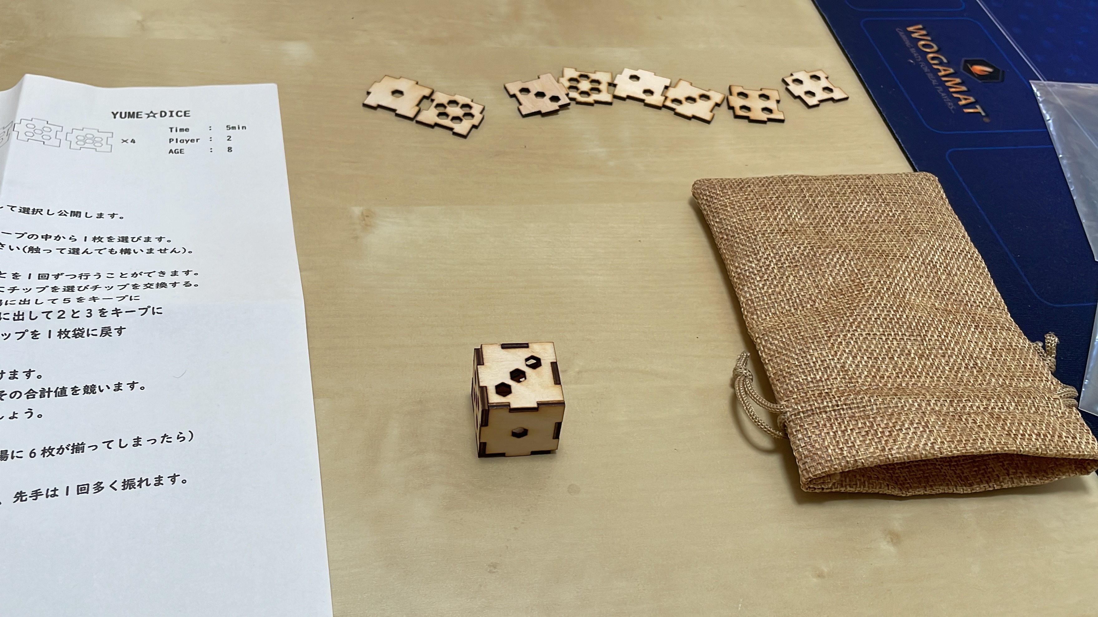 サイコロのパーツを引きあって、サイコロを作って出目勝負をします。パーツの引き当てに一工夫があって、無理やり早く作ることもできます。