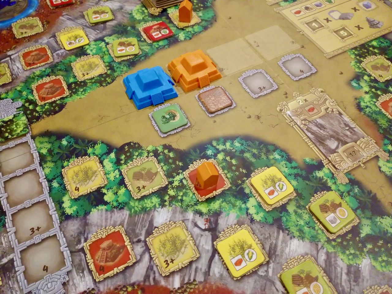 「1ゲームの手番の回数がわずか5回」であることが話題となった『サポテカ』。プレイヤーの目的は、メソアメリカのサポテカ文明の首都の周りに建物やピラミッドを建設し、神々に供物を捧げて貢献することです。ゲーム終了時に、プレイヤーはピラミッド、自分の建物、そして供物トラックから得点を得ることができます。