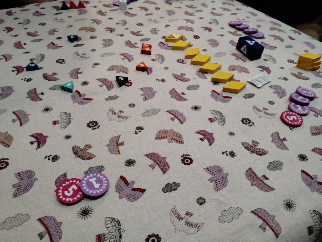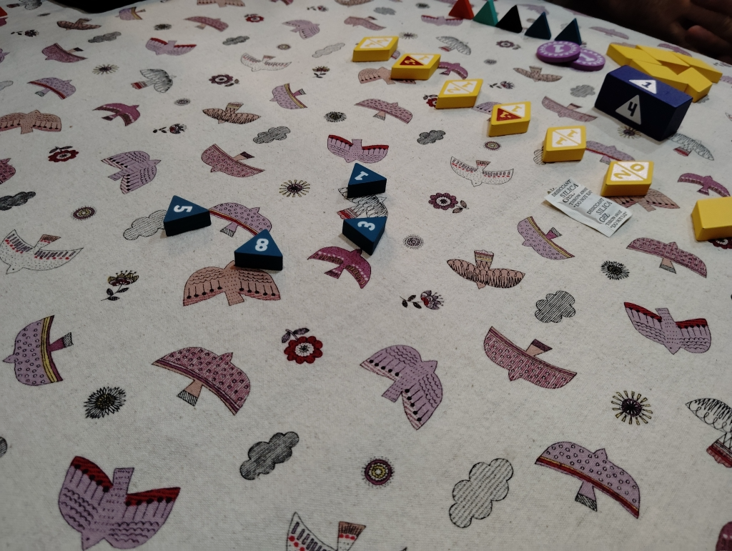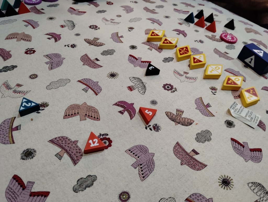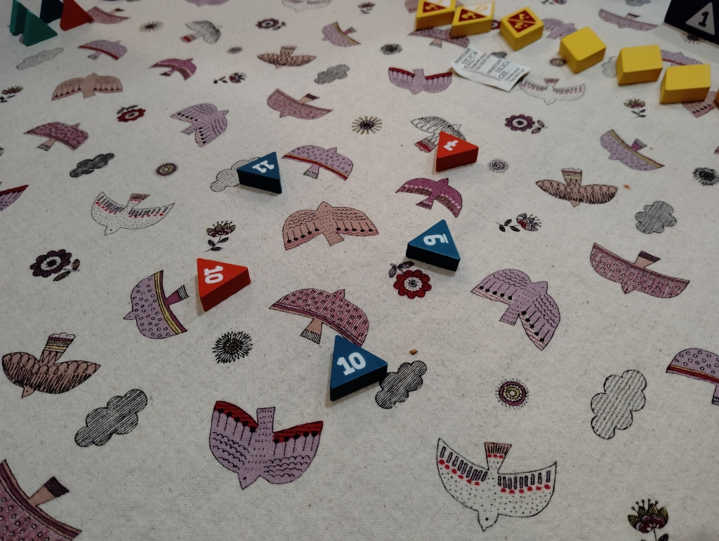 トリックでプレイされた木駒の色ごとに数字合計を確認して、最大合計の色がトリックを獲得する権利ができて、1番大きい数字と2番目に大きい数字が得点を獲得します。
