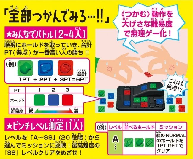 ホールドという表面に凹凸のあるコマを、指二本でつまんで落とさずにゴール地点まで運ぶだけ。