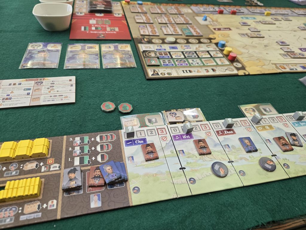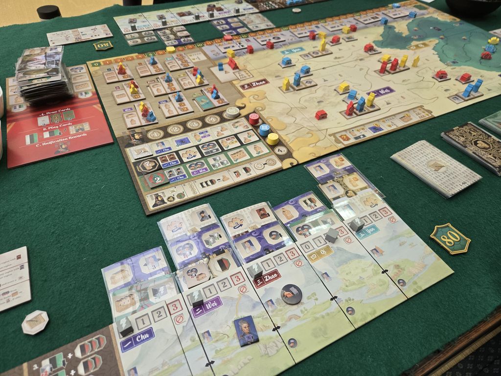明治維新がワーカーピック。シニョーリエがダイスピック。今回の春秋戦国はカードプレイ。各ゲーム共にアクションに制限をかけている点もよく似ている。ラウンドボーナスとアクション数の二律背反。明治が色による制約、シニョがダイス目合計、春秋はカードのhigh&lowによる制限とタブロービルド。何かに縛られながら上手くゲームを回していく感覚は3ゲーム共通のジレンマ。
