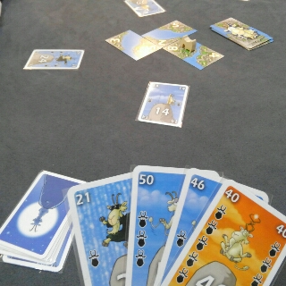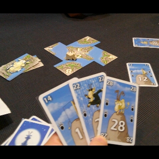 これを4ラウンドまでしたら、丘カードが繋がりますので、その数字の合計が、今回トリックを獲得したカードに描かれているヤギの頭の合計上限になります。