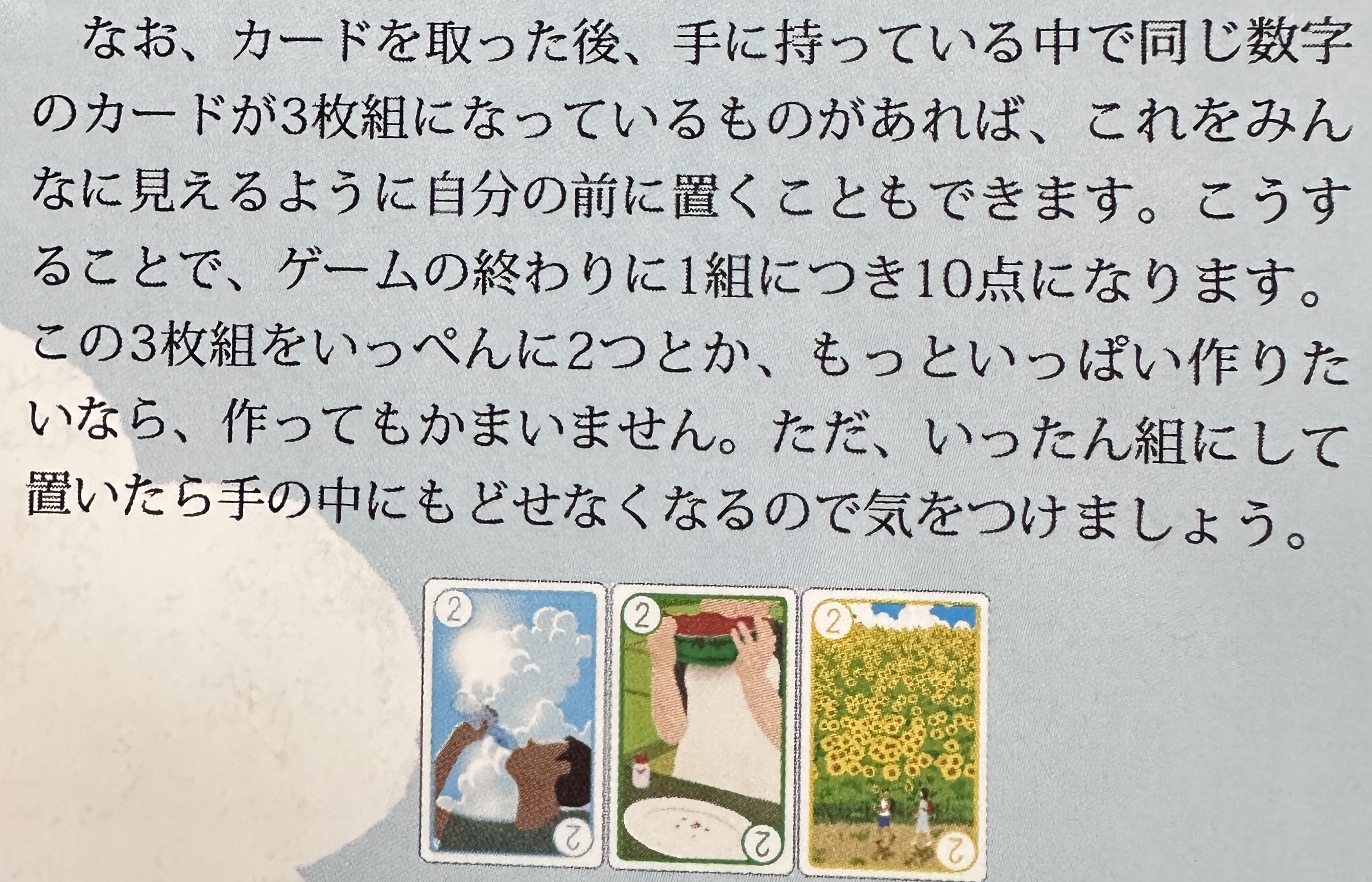 山札からカードをめくり、手札に加えて3枚のセットコレクションにするか、得点の高いカードを集めて手札を充実させて合計点を競うカードゲームです。