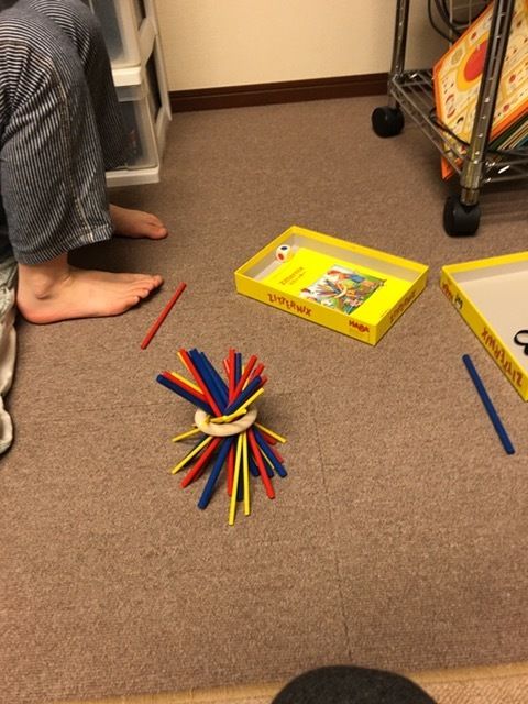 青色、赤色、黄色の3色のスティックの束を丸いリングで支えて、サイコロの出目色で引き抜き続け、一番最初に束を倒した人が負けとなるゲームです。