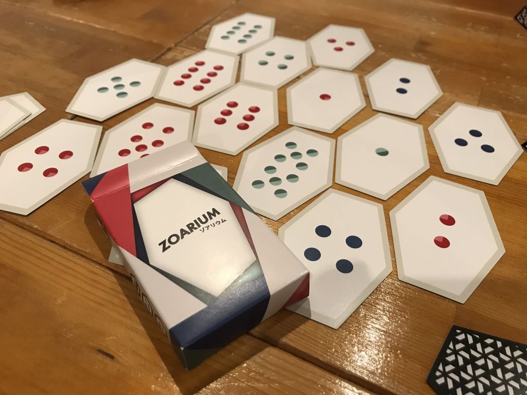 六角形のカードは1~10の点と3色で計30枚あって、それらを並べていって、ある規則通りに一筆書きに辿れたら勝ちといったゲームです。