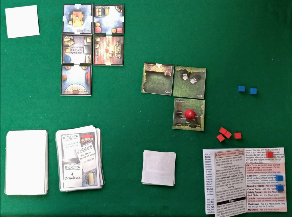 探索にはタイルを引いて配置し、移動のたびにイベントカードを引いて対処する必要がある。ゾンビが出たら戦闘を行い、出現数に対して足りない攻撃力分のダメージを受ける。