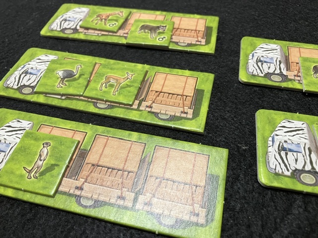 自分の手番には、このように「動物タイルを引いてトラックに乗せる」か、または「すでにいくつか動物タイルが乗っているトラックを自分の動物園に引き取る」か、どちらか1つしかできません。