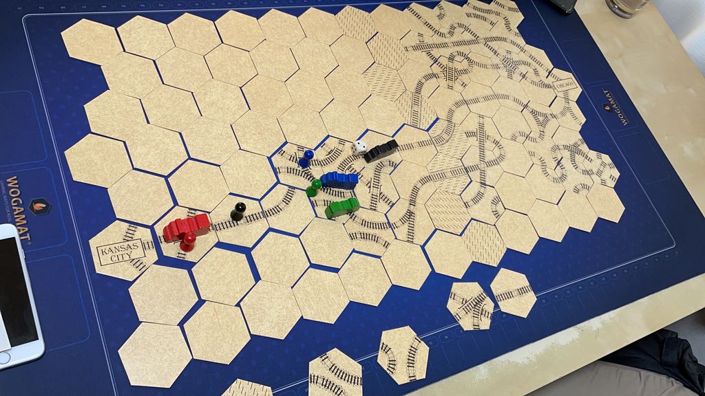 シカゴからカンザスシティまで線路をつないで、自分の列車を連れていくゲームです。タイルをめくって好きな方向に回せるので、出来上がりも楽しいし、パズルチックです。
