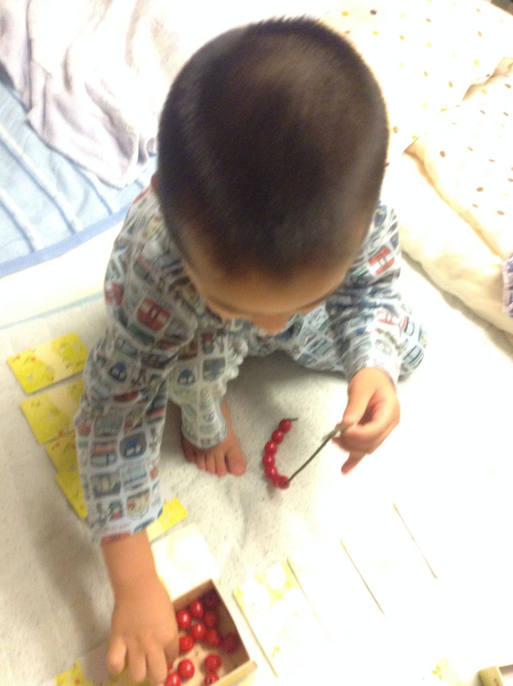 しかし、勝つこと自体は目的ではなく、子どもに数を覚えてもらうことと、駒をヒモに通すことで手先を使うことです。
