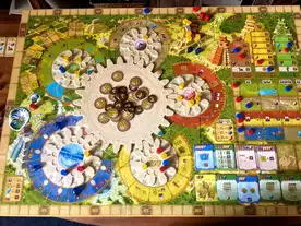 ツォルキンは回転する複数の歯車であらわされ、ゲームの進行にあわせて時を刻むことになります。プレイヤーはこの歯車の回転により常に変化する盤面を考慮してゲームを進めなくてはなりません。作物の収穫をし、物資を集め、記念碑を建立し、神々の怒りを鎮めるのも、このツォルキンの進行がかかわるのです。
