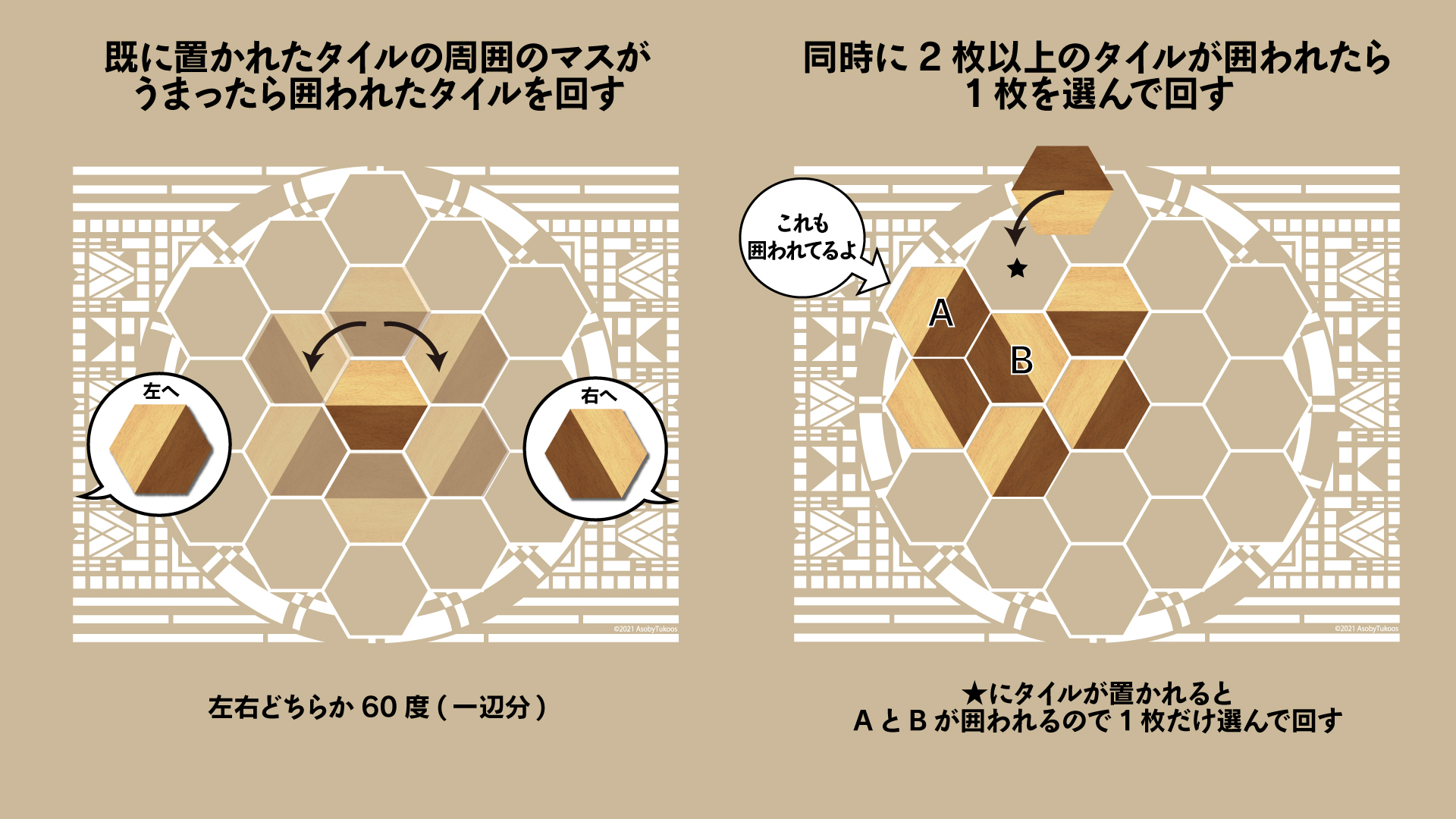 タイルを置いた際に、周囲がすべて埋められたタイルがある場合、それらの内の1枚を選んで、60度回転させる。これは必ず行う。