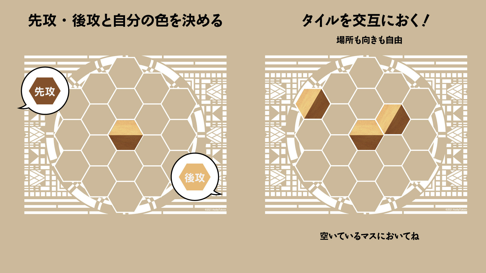 2色の六角形のタイルを交互に置いていき、自分の色が7枚繋がったら勝利する。