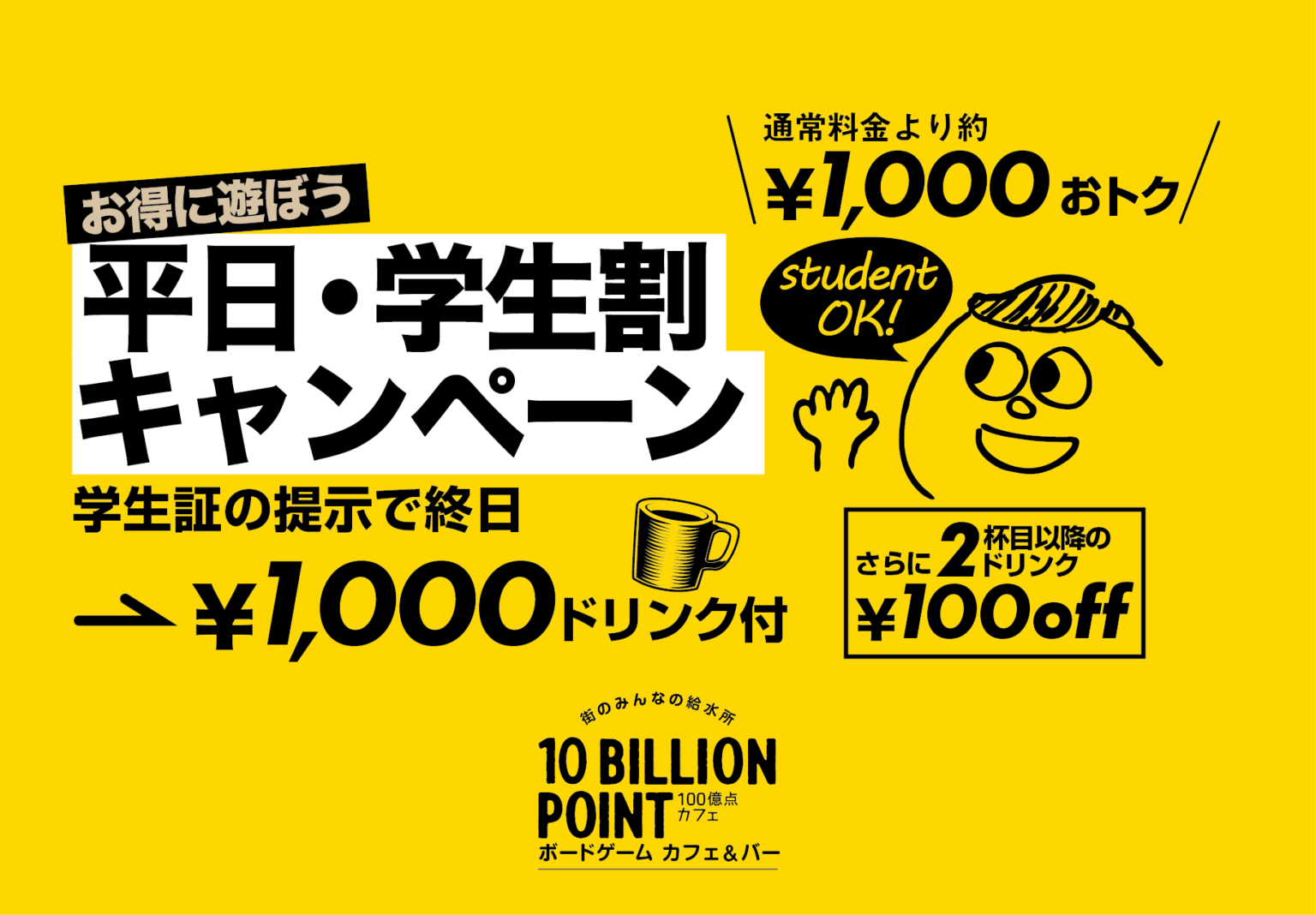 - 約4年前2021年10月02日 16時13分頃🏫👦👧平日・学生割キャンペーンこんにちは。東京都新宿区の神楽坂と江戸川橋のあいだにあるボードゲームカフェ&バー10billionpoint(テンビリオンポイント)です。学生さん向けに、平日のお得なキャンペーンを開始!この機会にぜひご利用ください。▼🙋うけつけ方法入店時、学生証の提示で平日の利用料金が『終日1,000円(1ド...88ページビュー