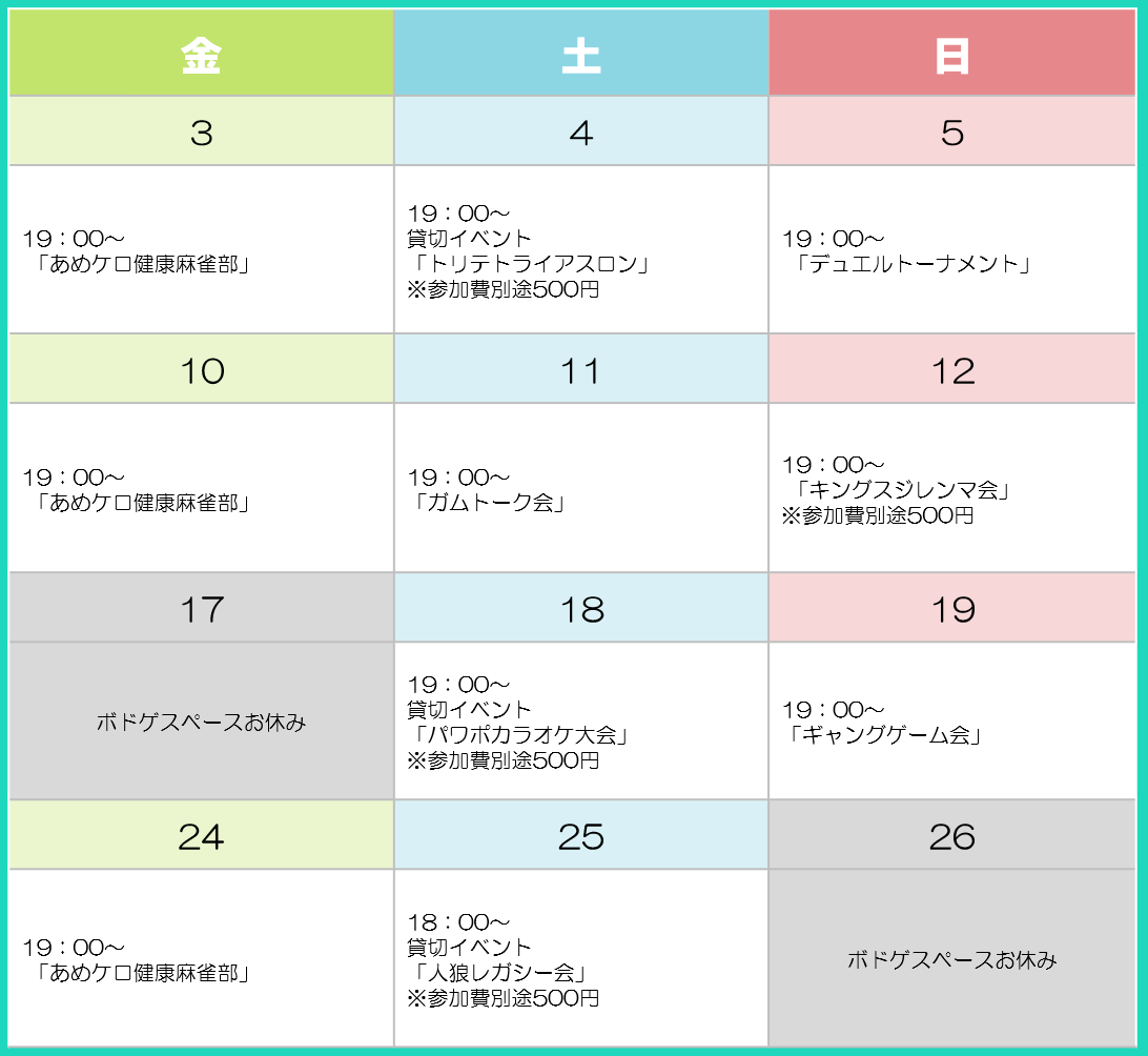 - 3年弱前2023年02月28日 20時10分頃2023年3月スケジュール1月から営業日に木曜日が加わりました。遊びたいけど週末は・・・というかたも来ていただけたらなと思います。ボードゲームスペースあめかえるは感染防止に配慮しながら3月は以下のとおり営業をします。※健康に少しでも不安のある方の入場はご遠慮ください☆定員は4卓16名です○換気をしながらの営業となります...323ページビュー