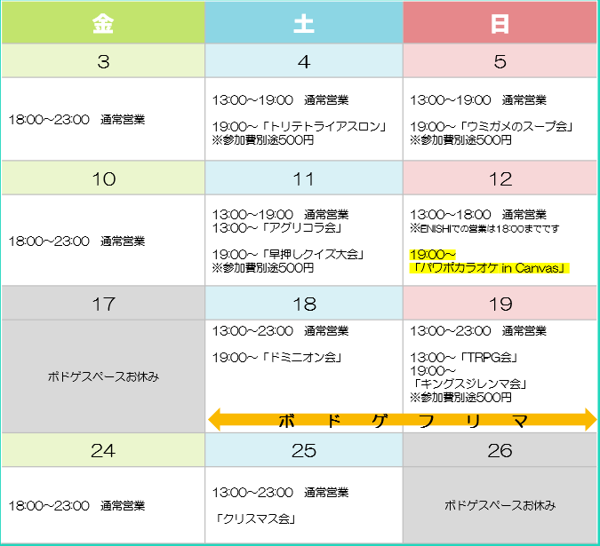 - 3年弱前2023年02月28日 20時10分頃2023年3月スケジュール1月から営業日に木曜日が加わりました。遊びたいけど週末は・・・というかたも来ていただけたらなと思います。ボードゲームスペースあめかえるは感染防止に配慮しながら3月は以下のとおり営業をします。※健康に少しでも不安のある方の入場はご遠慮ください☆定員は4卓16名です○換気をしながらの営業となります...323ページビュー