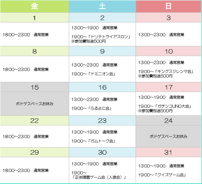 - 2年以上前2023年05月04日 11時29分頃2023年5月スケジュール5月から営業日に月曜日も加わり、営業時間を以下の通り変更します。【営業時間】月・木・金18:00~23:00土曜・日曜13:00~23:00ボードゲームスペースあめかえるは感染防止に配慮しながら5月は以下のとおり営業をします。※健康に少しでも不安のある方の入場はご遠慮ください☆定員は4卓16名...352ページビュー