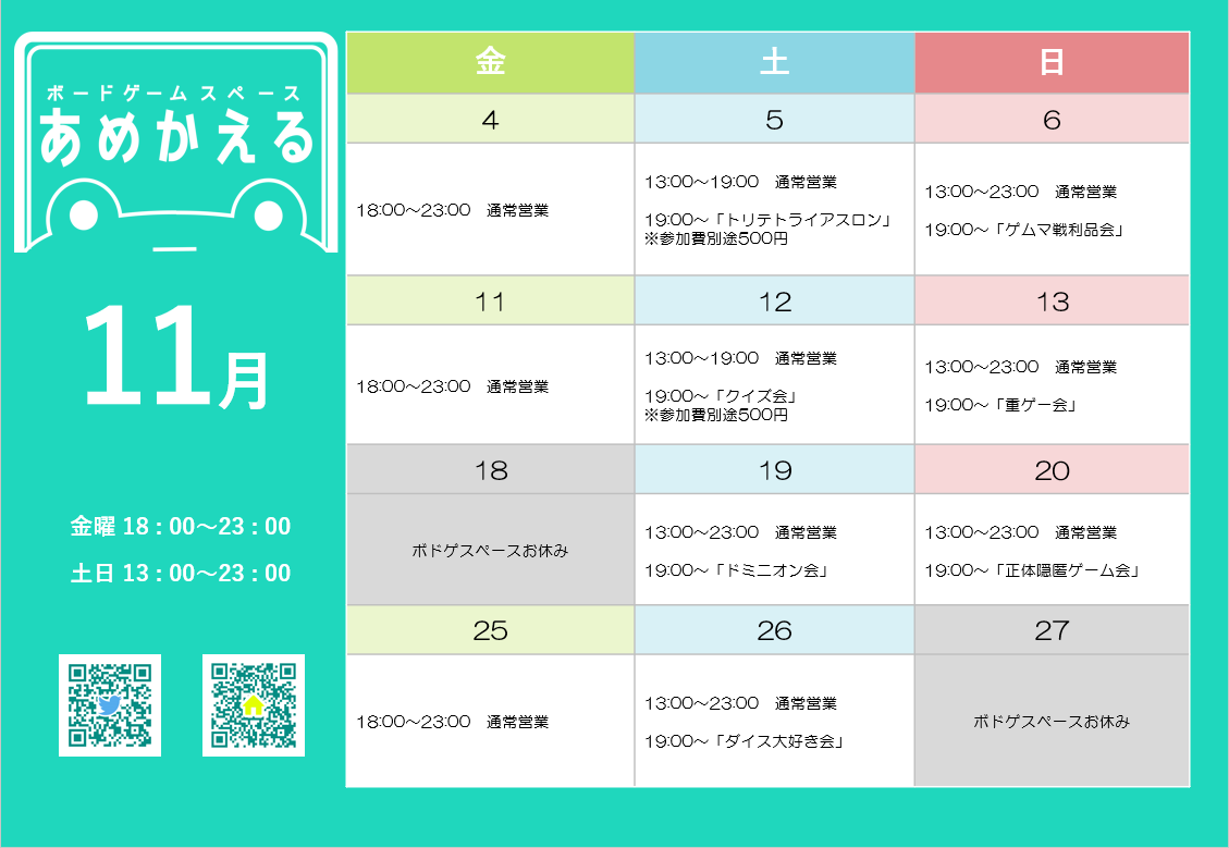 ボードゲームスペースあめかえるは感染防止に配慮しながら11月は以下のとおり営業をします。
