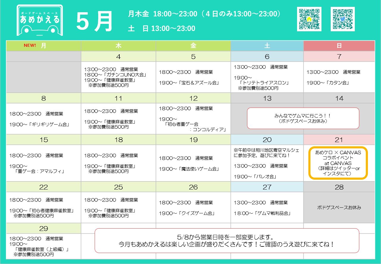 - 2年以上前2023年05月04日 11時29分頃2023年5月スケジュール5月から営業日に月曜日も加わり、営業時間を以下の通り変更します。【営業時間】月・木・金18:00~23:00土曜・日曜13:00~23:00ボードゲームスペースあめかえるは感染防止に配慮しながら5月は以下のとおり営業をします。※健康に少しでも不安のある方の入場はご遠慮ください☆定員は4卓16名...352ページビュー