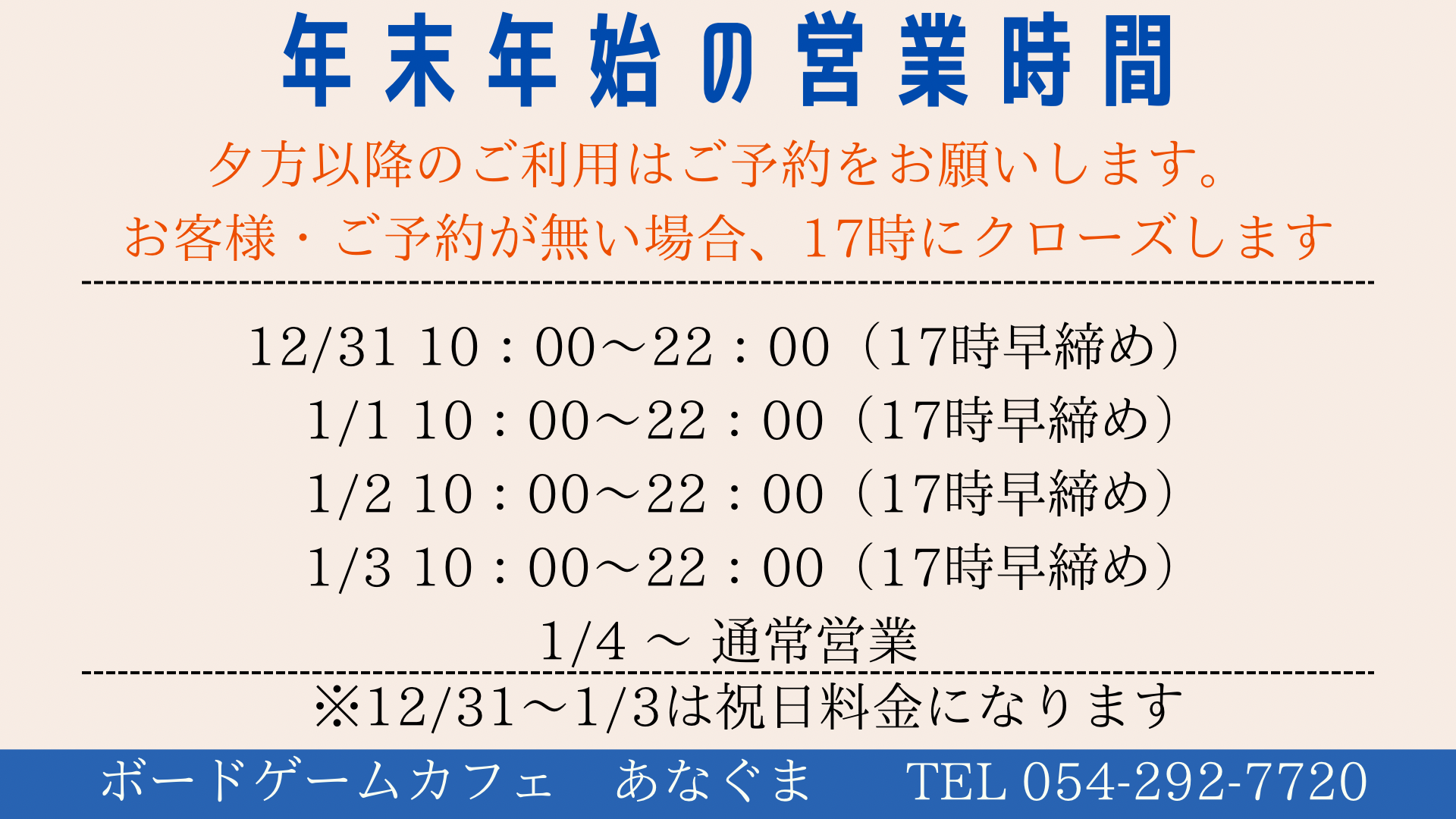 - 2年以上前2023年03月13日 15時56分頃3月13日から営業時間が変更になります。いつもご利用いただきありがとうございます!ボードゲームカフェあなぐまです。平日の営業時間が下記の日程に変更になります。土日祝日は変わりませんので、ご承知おきください。45ページビュー
