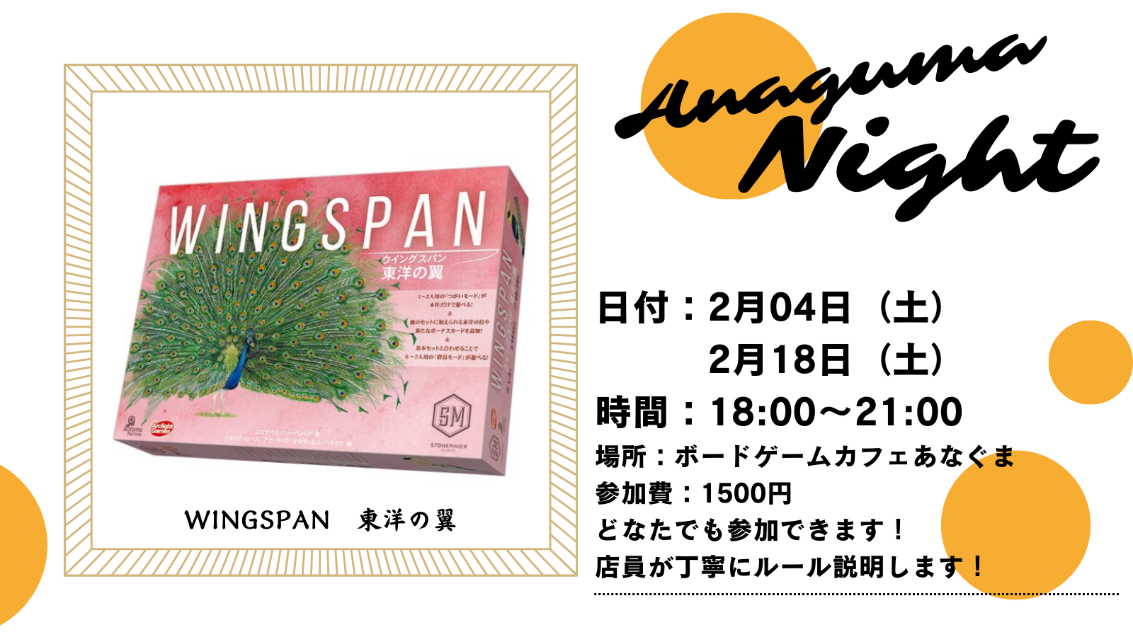 - 2年以上前2023年04月28日 17時13分頃5月から平日ボードゲーム会を再び実施をしていきます!こんにちは!静岡ボードゲームカフェあなぐまのTomoです。5月から再び平日ボードゲーム会・休日ボードゲーム会を実施していきます!日程や内容については、随時Twitterやホームページで発信していきます!初めてボードゲームを遊んだ人が、他にも色々遊んでみたりボードゲーム仲間を見つけられる場所に出...92ページビュー