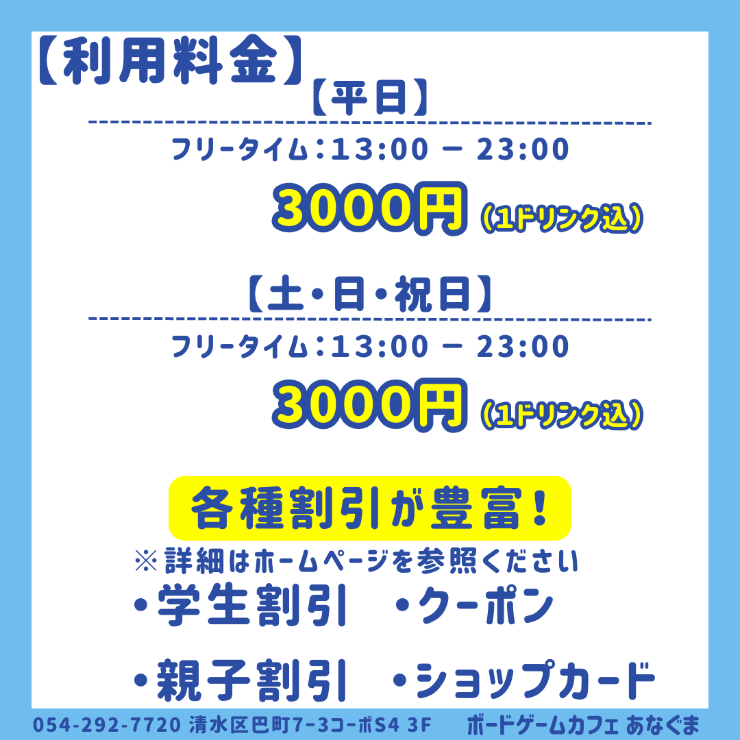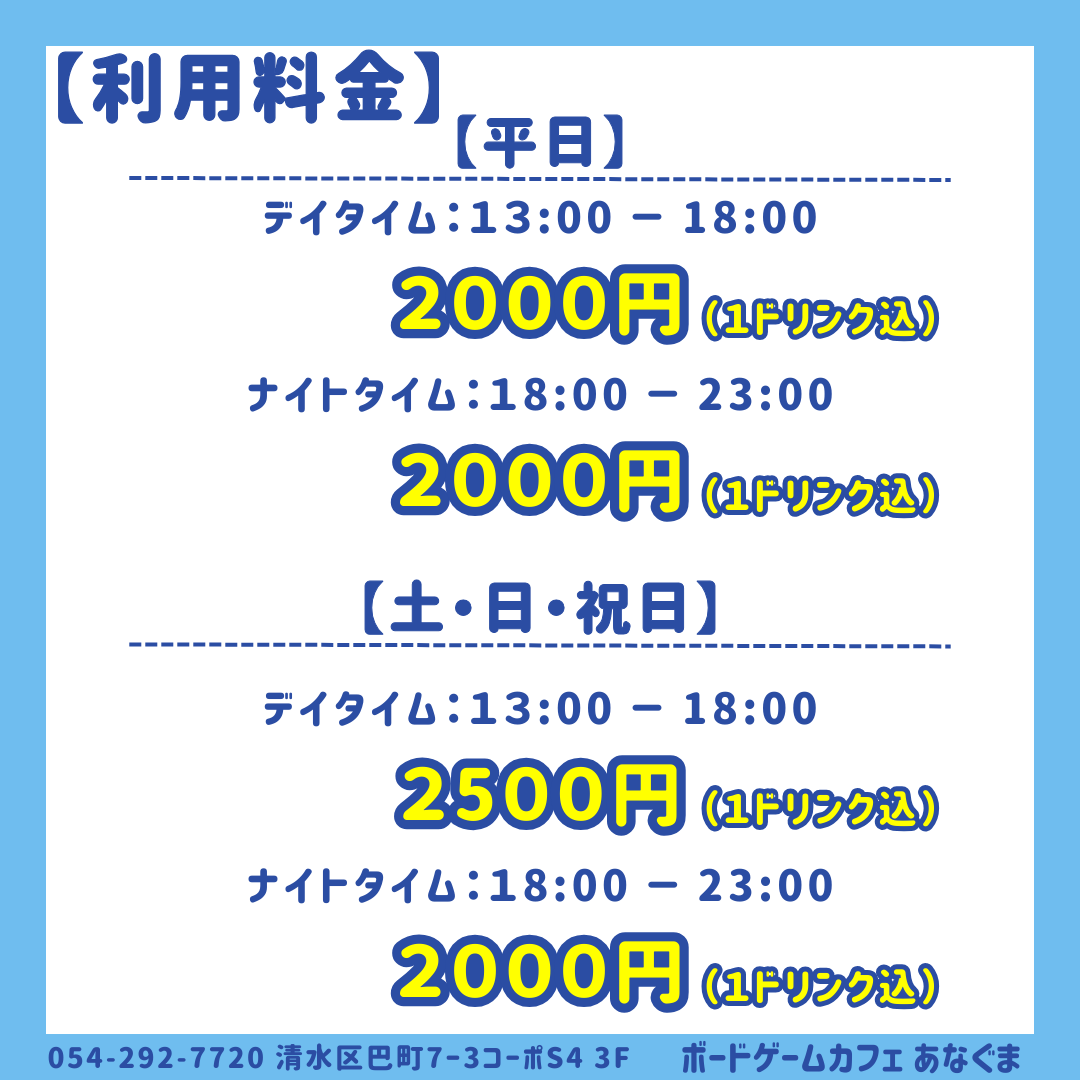 2000円(カフェ・バー利用の場合にはドリンク代)~フリータイム料金3000円