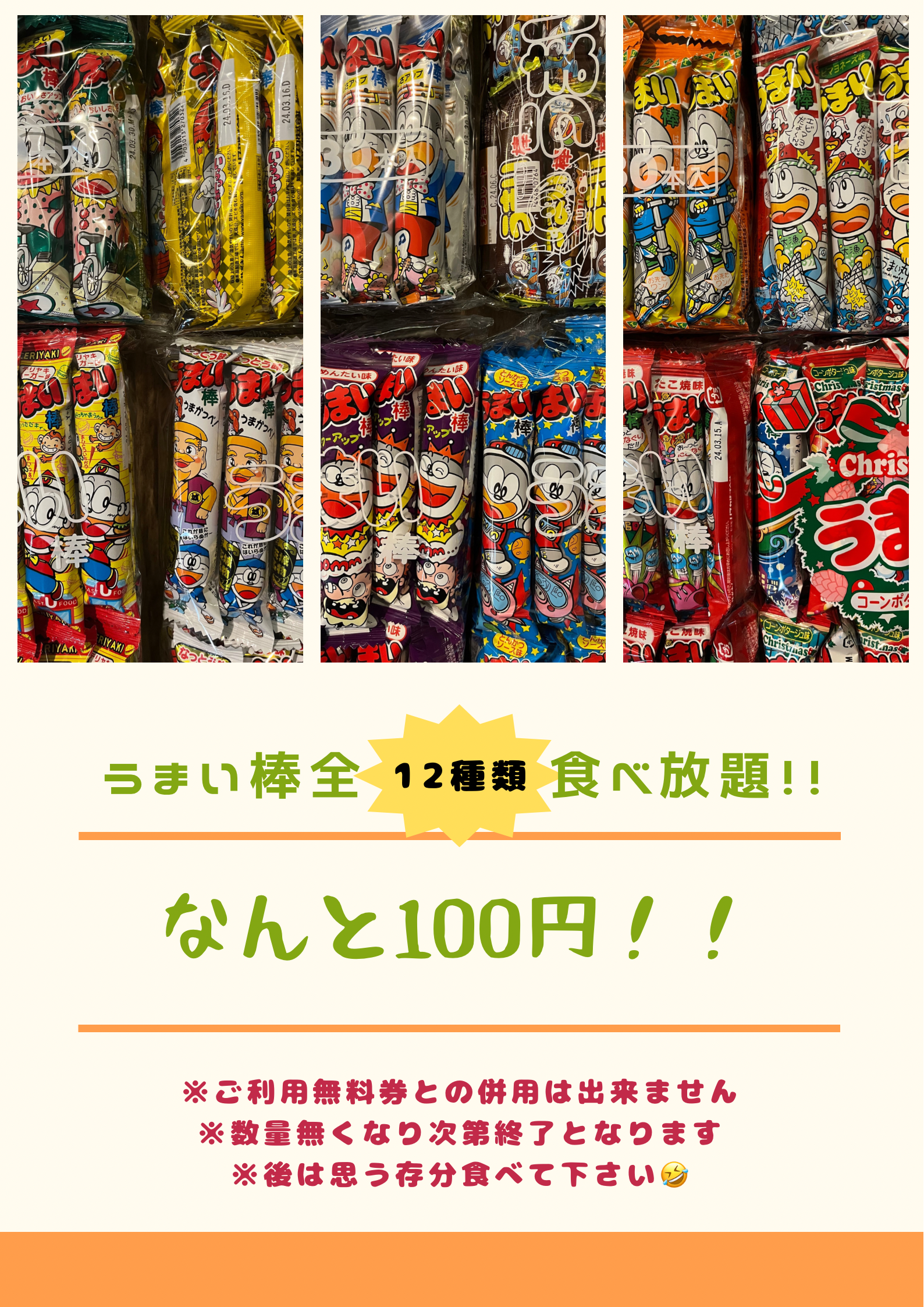 12月1日(金)より、期間限定でうまい棒全12種類食べ放題100円を実施します😆