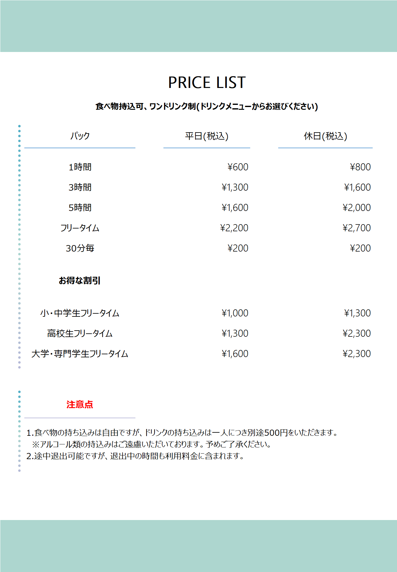 料金/メニュー表