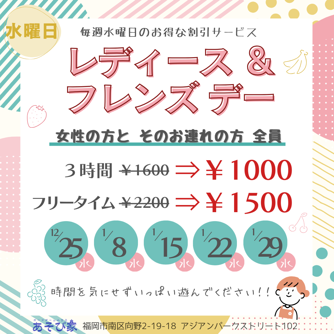 12/25~1/29までの水曜日は「レディース&フレンズデー」!