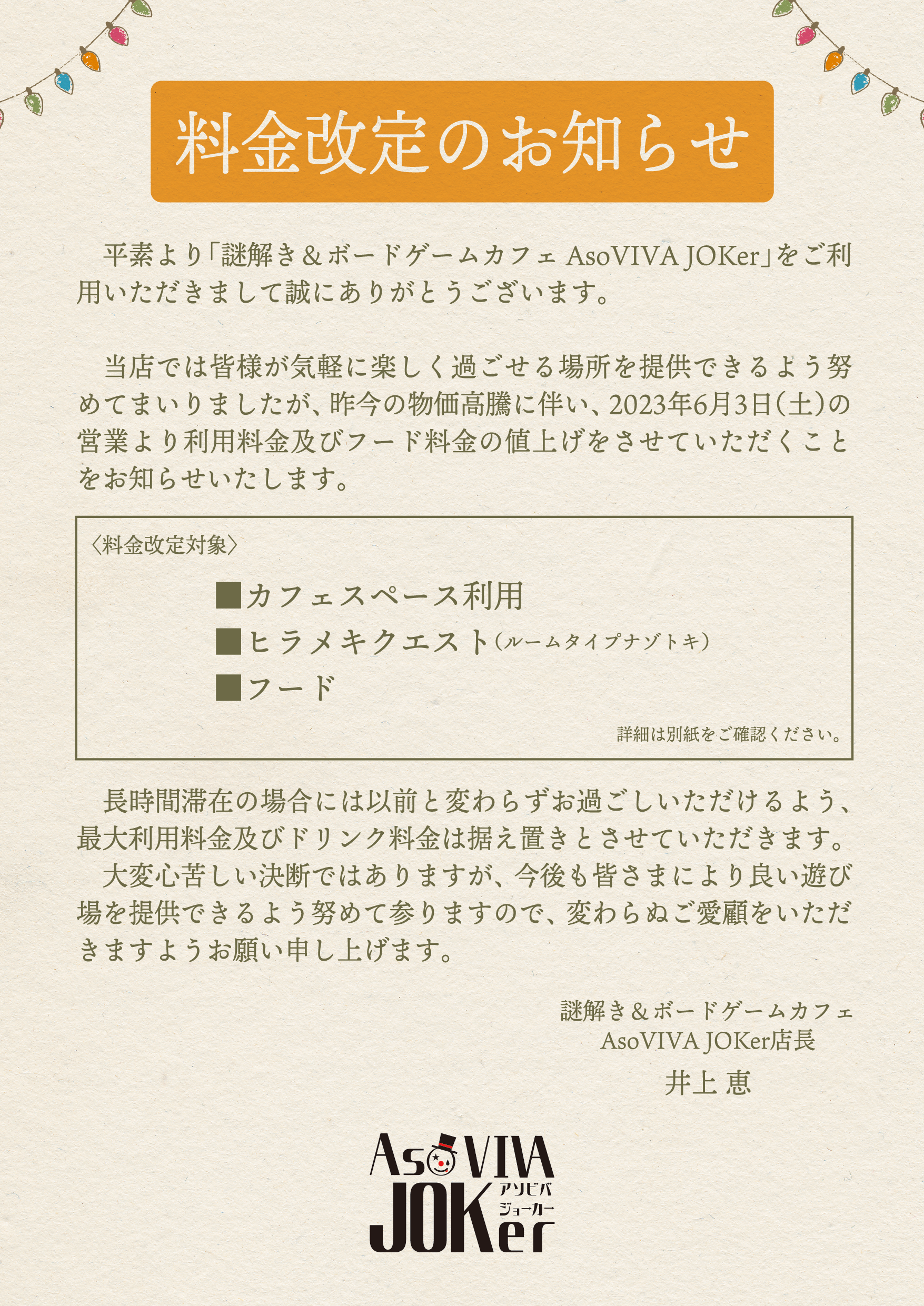 - 11ヶ月前2025年01月15日 16時43分頃2025年 5周年記念イベント開催!みなさまあけましておめでとうございます!2025年もどうぞよろしくお願いいたします。AsoVIVAJOKer今年の1/11に5周年を迎えました。5周年を迎えられる感謝を込めて、たくさんのイベントをご用意してお待ちしております!【5周年イベント①】新年恒例イベント!アソビバ来店くじ&ワクワクボド...58ページビュー