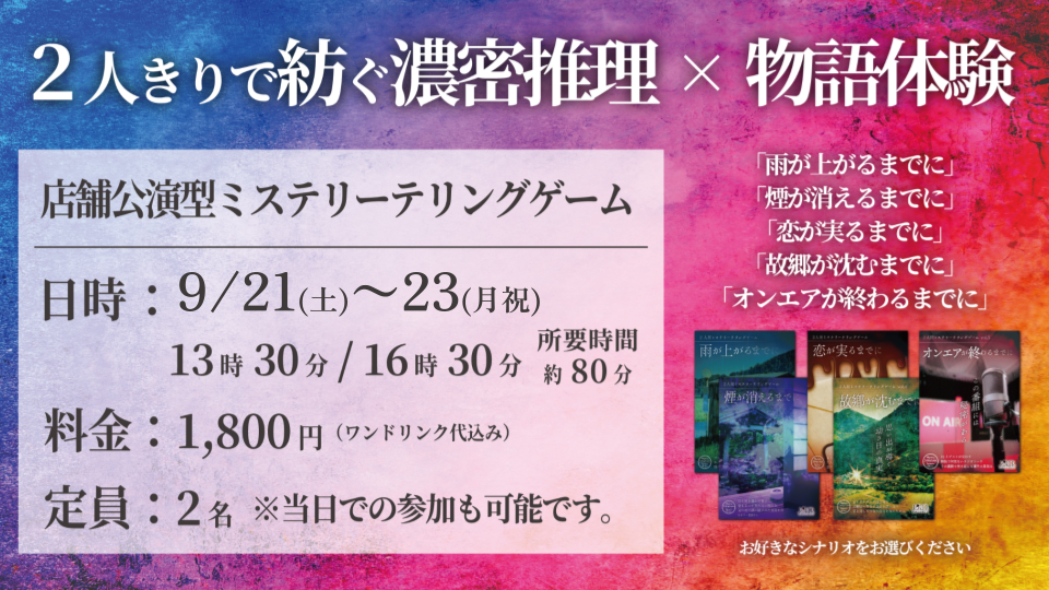 ▶イベント参加予約◀【ミステリーテリングゲームとは?】物語を作り上げること(storytelling)と謎を解くこと(tell a mystery)を組み合わせた -------------------------------------------------------------------- 【開催概要】当日参加するお二人でプレイするゲームを選べるイベントです。 ① 雨が上がるまでに ② 煙が消えるまでに ③ 恋が実るまでに ④ 故郷が沈むまでに ⑤ オンエアが終わるまでに