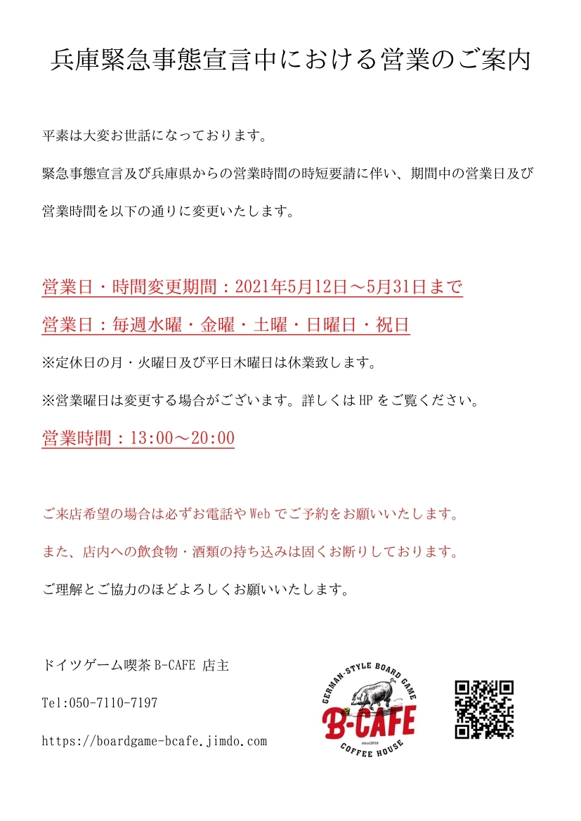 - 1年以上前2024年05月08日 14時56分頃【お知らせ】B-CAFE再建クラウドファンディング開始のお知らせ2024年4月15日に火災があった兵庫県姫路市のボードゲームカフェ「ドイツゲーム喫茶B-CAFE」の再現に向けてのクラウドファンディングが開始されました。ご支援はもちろん、まわりの方にご拡散いただけるだけでも大変助かります。どうかよろしくお願いいたします。火災で失った姫路のボードゲームカフェを...101ページビュー