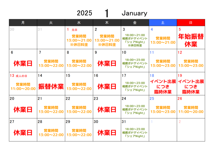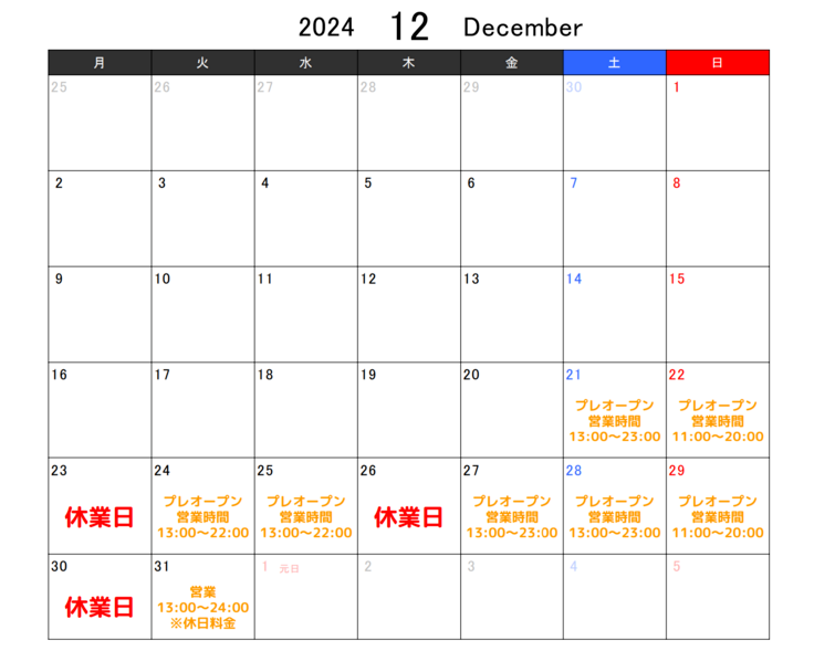 31日~4日までの営業時間は以下のカレンダーをご確認くださいませ。