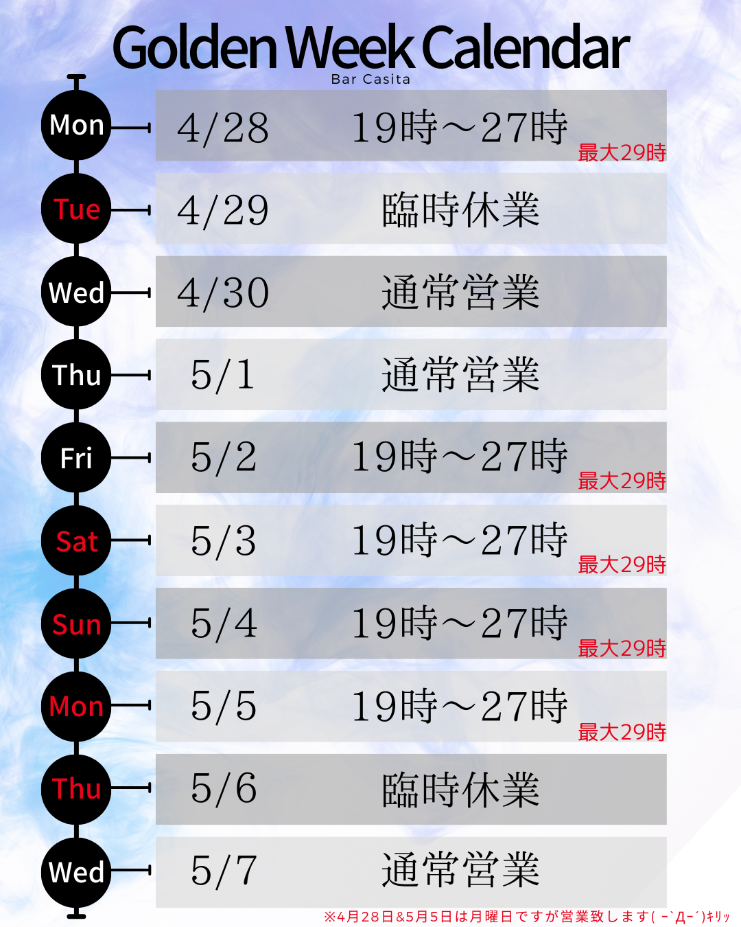 - 8ヶ月前2025年03月31日 23時58分頃ゴールデンウィークの営業時間のお知らせBarCasitaよりGoldenWeekの営業時間のお知らせです!!基本的に毎週月曜はお休みを頂戴しておりますがご予約と祝前日の事もありますので、4月28日(月)&5月5日(月)は営業致します(ー`дー´)キリッ変則的な営業日となりますがお間違えのないようにお願い致します。また祝前日...34ページビュー