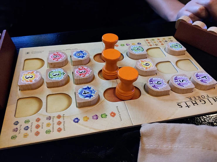 店では最近、ゲームマーケット2019秋で入手した新作、 巨匠ライナー・クニツィアの「ナイツポーカー」がとてもよく遊ばれています。