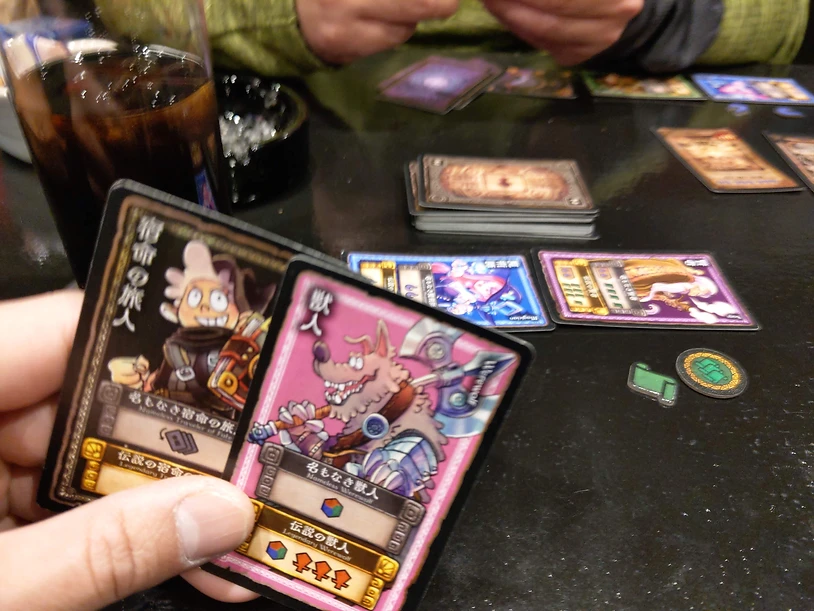 即時発動と、1ターン遅延する伝説化があり、伝説のほうが効果が強いのですが、バッティングすると何もそのターン行動できない制約があります。つまり相手とかぶらないカードを出す必要があるため、スタートプレイヤーがめちゃくちゃ不利なゲームです...