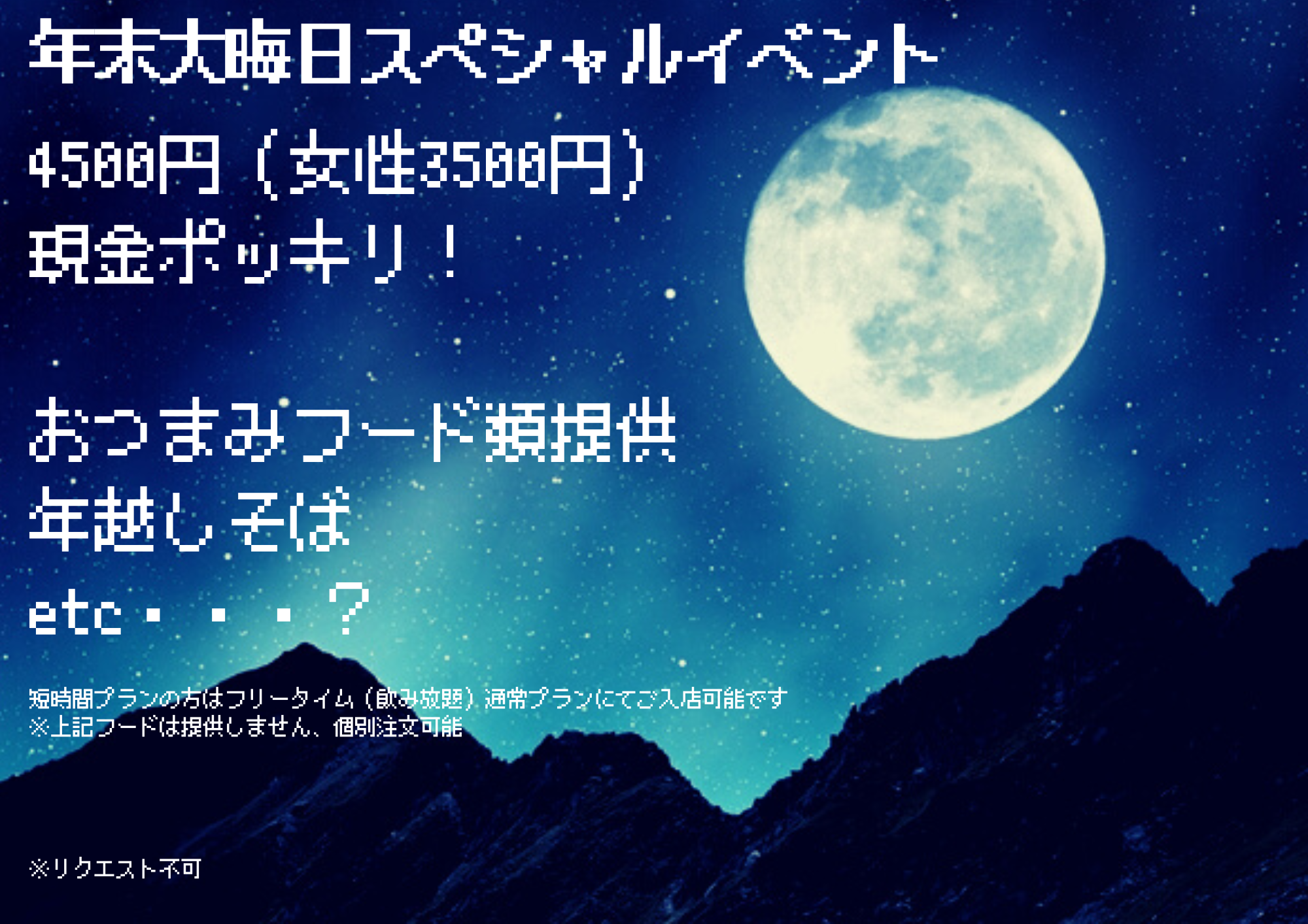 31日 大晦日スペシャルデイ! 13時OPEN検討中 男性4500円 女性3500円、飲み放題&年越しそば&フード付き