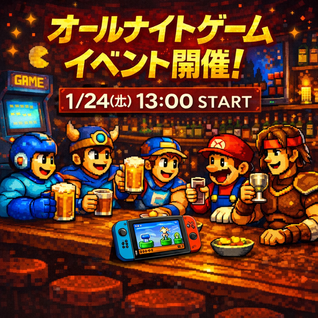 - 約6時間前2026年01月24日 17時28分頃本日開催!オールナイトゲーム×TRPG同時開催|ギルド酒場るすと(安城)「週末、何か面白いことしたい」「一人でも行ける遊び場がほしい」——そんな人に向けて、本日はギルド酒場るすとでオールナイトゲームイベントを開催中!さらに同時進行で、テーブルトークRPG(TRPG)イベントも回しています。話題トピック:いま“体験型の夜遊び”が増えてる最近は、ただ飲むだけじゃなくて...0ページビュー