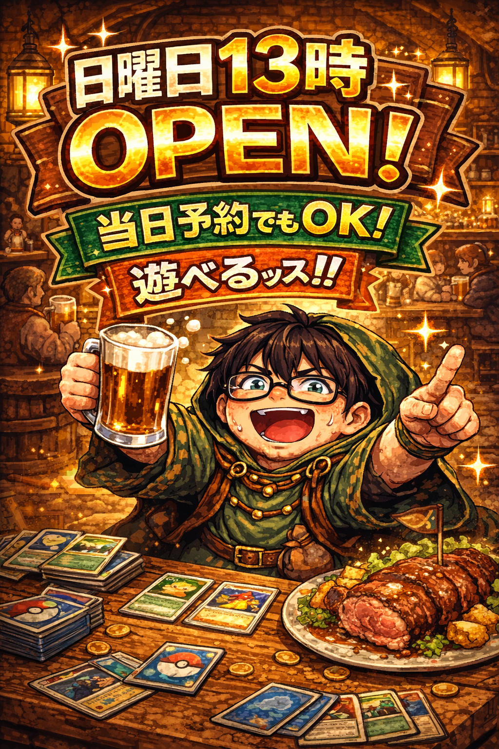 - 約7時間前2026年02月01日 10時34分頃日曜日は13時OPEN!気楽に遊べる通常営業デー日曜日は13時OPEN!気楽に遊べる通常営業デー日曜日のギルド酒場るすと、本日は13時OPENで通常営業です!今日は大会や交流イベントは行っていません。その分、気楽に・自由に・好きな遊び方ができる日です。◆当日予約・飛び込みOK「今から行こうかな?」「予定が空いた」そんなノリで大丈夫。当日予約...2ページビュー