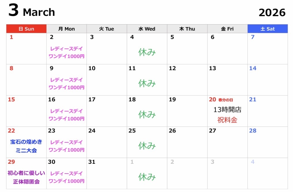- 約1年前2025年01月17日 00時10分頃1月のカレンダーです♪ 1月からはワンデイ500円引き!一月からはワンデイ500円引き!平日は1000円、土日祝は1500円で一日遊び放題です。毎週金曜は初心者歓迎会!19日は初心者に優しい正体隠匿会です!77ページビュー