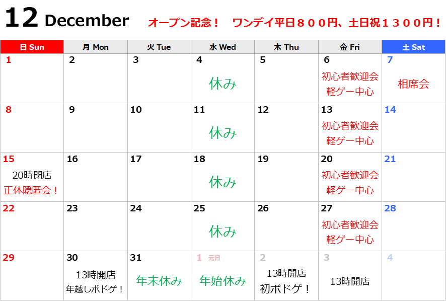 - 約1年前2024年12月02日 01時36分頃12月のカレンダーを更新!12月もワンデイ割引!!12月のカレンダーになります!12月もまだまだオープン記念でワンデイ料金を700円引きします。ワンデイ平日800円、土日祝は1300円で遊び放題なので是非遊びに来てください!毎週金曜は初心者歓迎会(経験者ももちろんOK)、15日(日)は初心者に優しい正体隠匿会などイベントも開催します。40ページビュー