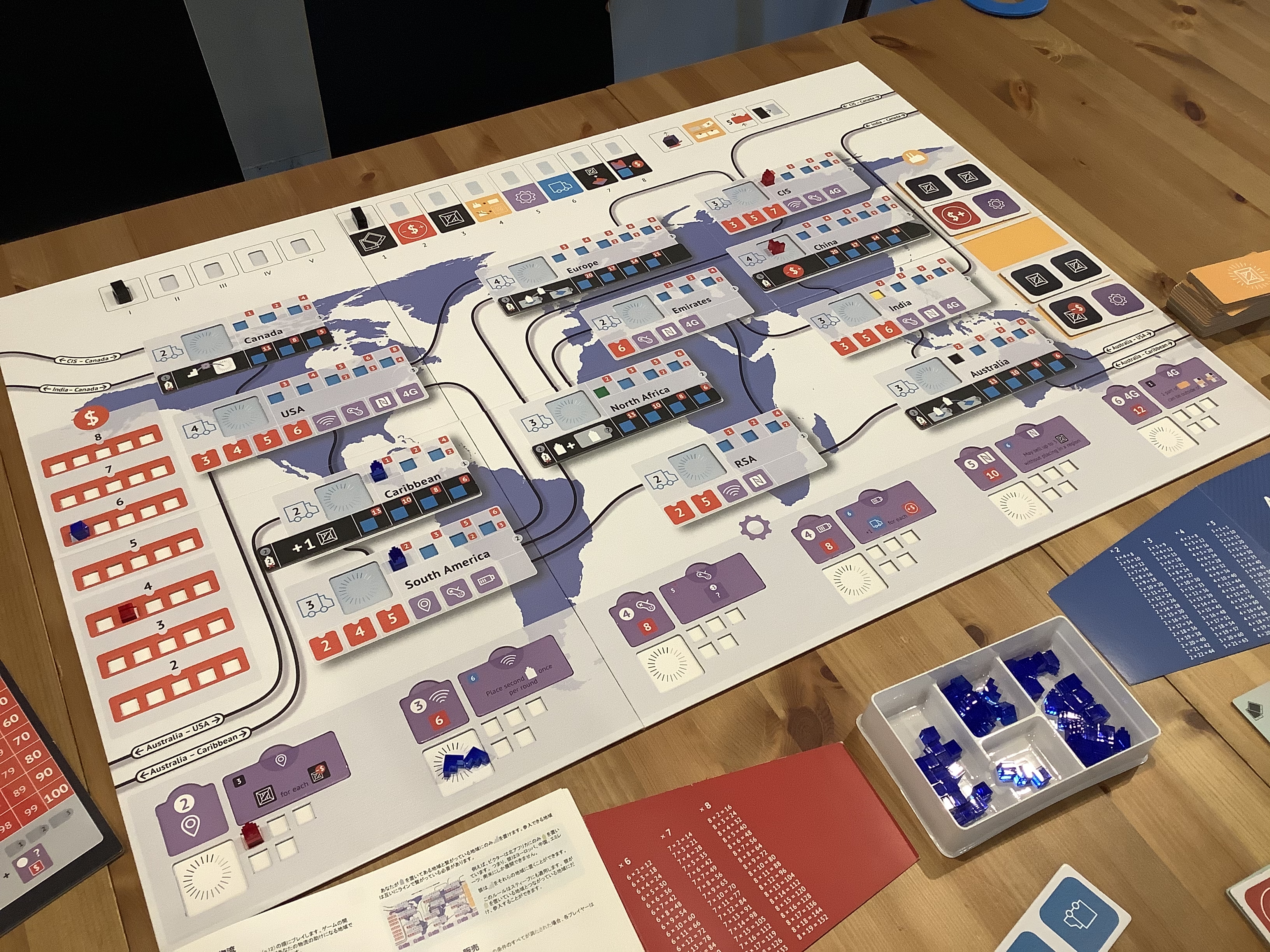 世界各地に拠点を建て、技術開発をし、他のプレイヤー=競合他社よりもたくさん商品を売って勝利点を稼ぐことが目的です。