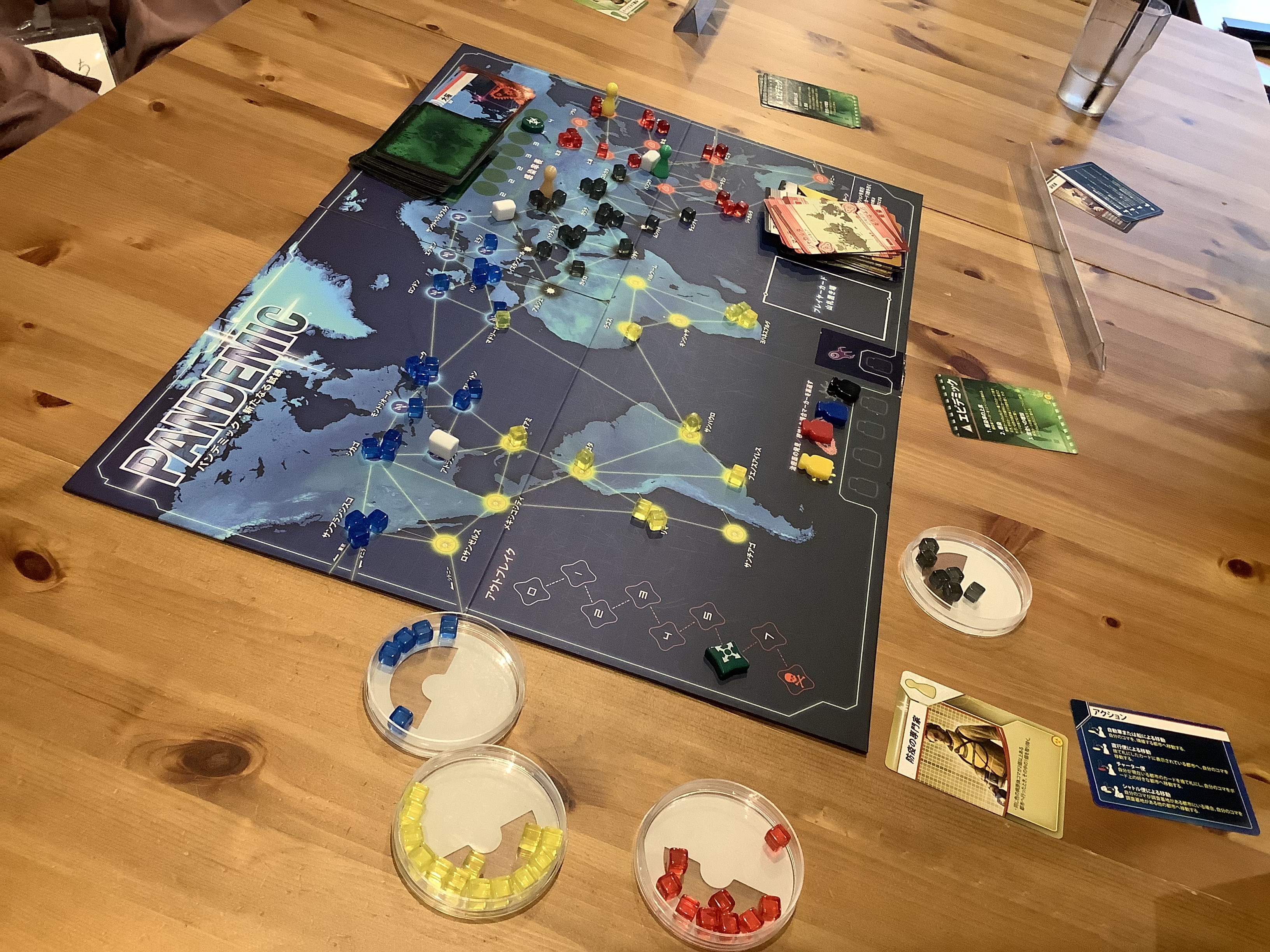 ルールはとても簡単で、4アクションを移動、治療、カード交換、研究施設の設置 、治療薬の開発、に振り分けて実行します。