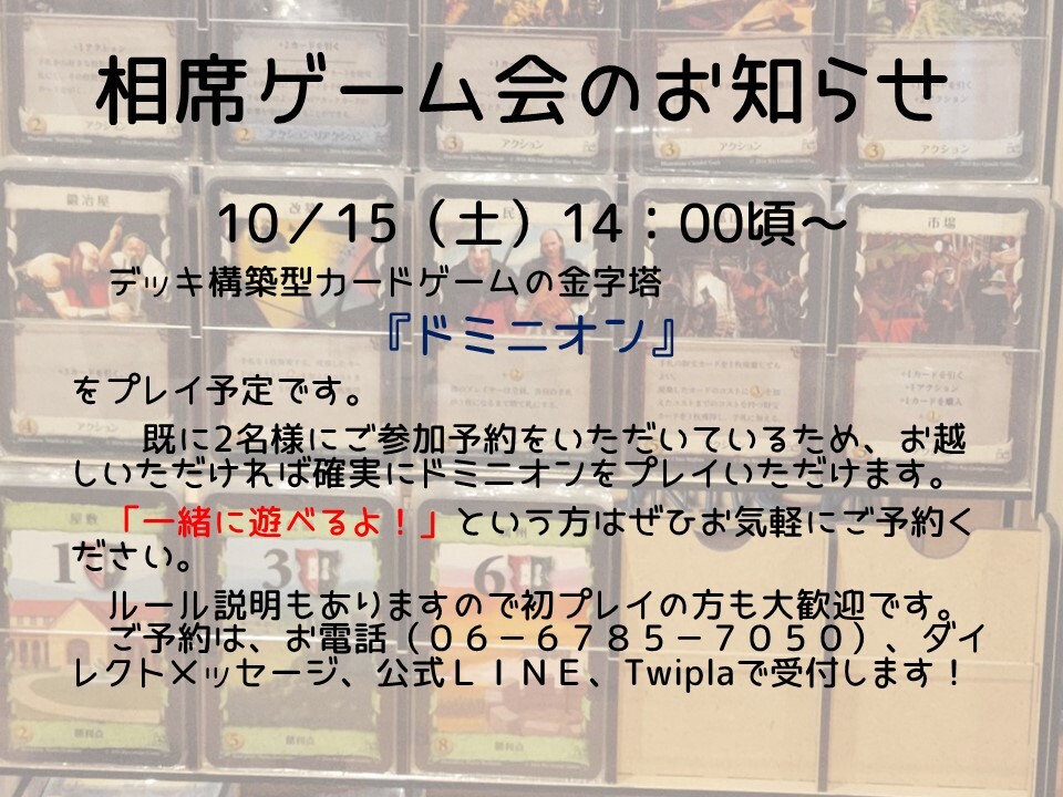 15(土)【土ミニオンの日】デッキ構築型ゲーム『ドミニオン』を遊ぶと一般の方は250円/30分(フリータイム2000円)