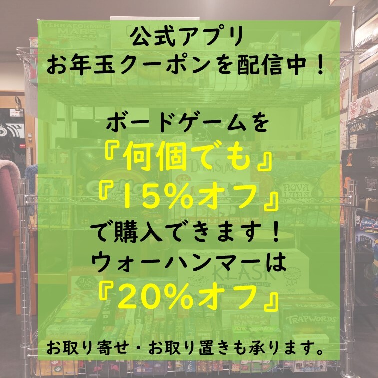 【お年玉クーポン】公式アプリクーポンで、ボードゲームが何品でも15%オフ、ウォーハンマーが何品でも20%オフで購入できます!