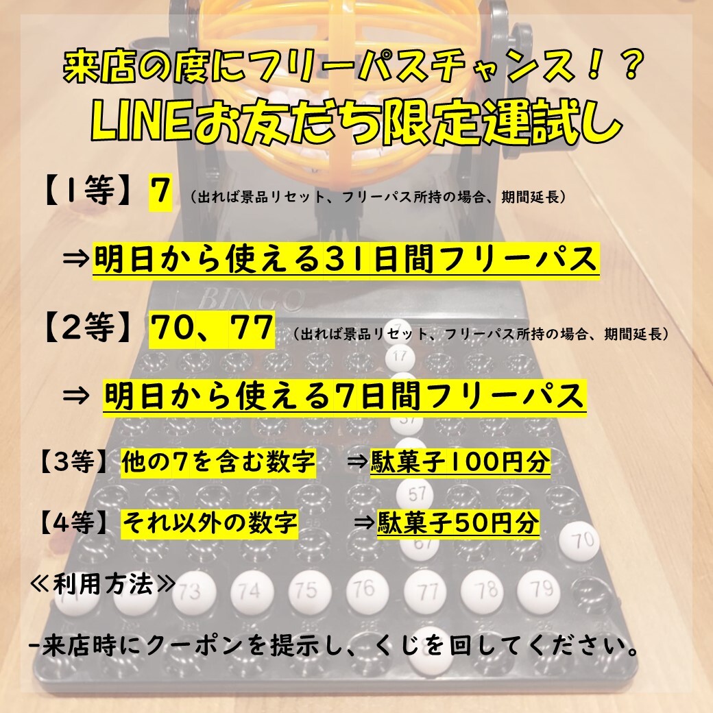 また、4月1日(土)より、公式アプリでは、2周年キャンペーンとして、「フリーパス20%オフ」や「平日プレイ料金10%オフ」となるクーポンを配信いたします。また、公式LINEでは来店の度に引ける、「最大でフリーパスが当たるくじ引き」クーポンや、「来店の度に特典を受け取れるショップカード」をご用意いたしますので、これらもご利用いただければ幸いです。