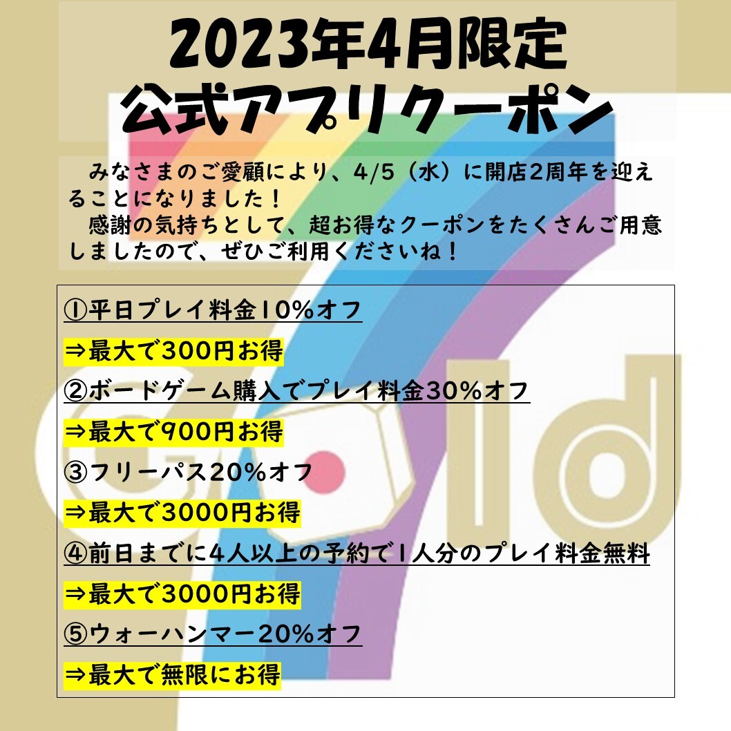 ボードゲームカフェ7Goldは4月5日(水)に開店2周年を迎えます。いつもご来店くださる皆さまには、感謝の言葉もありません。