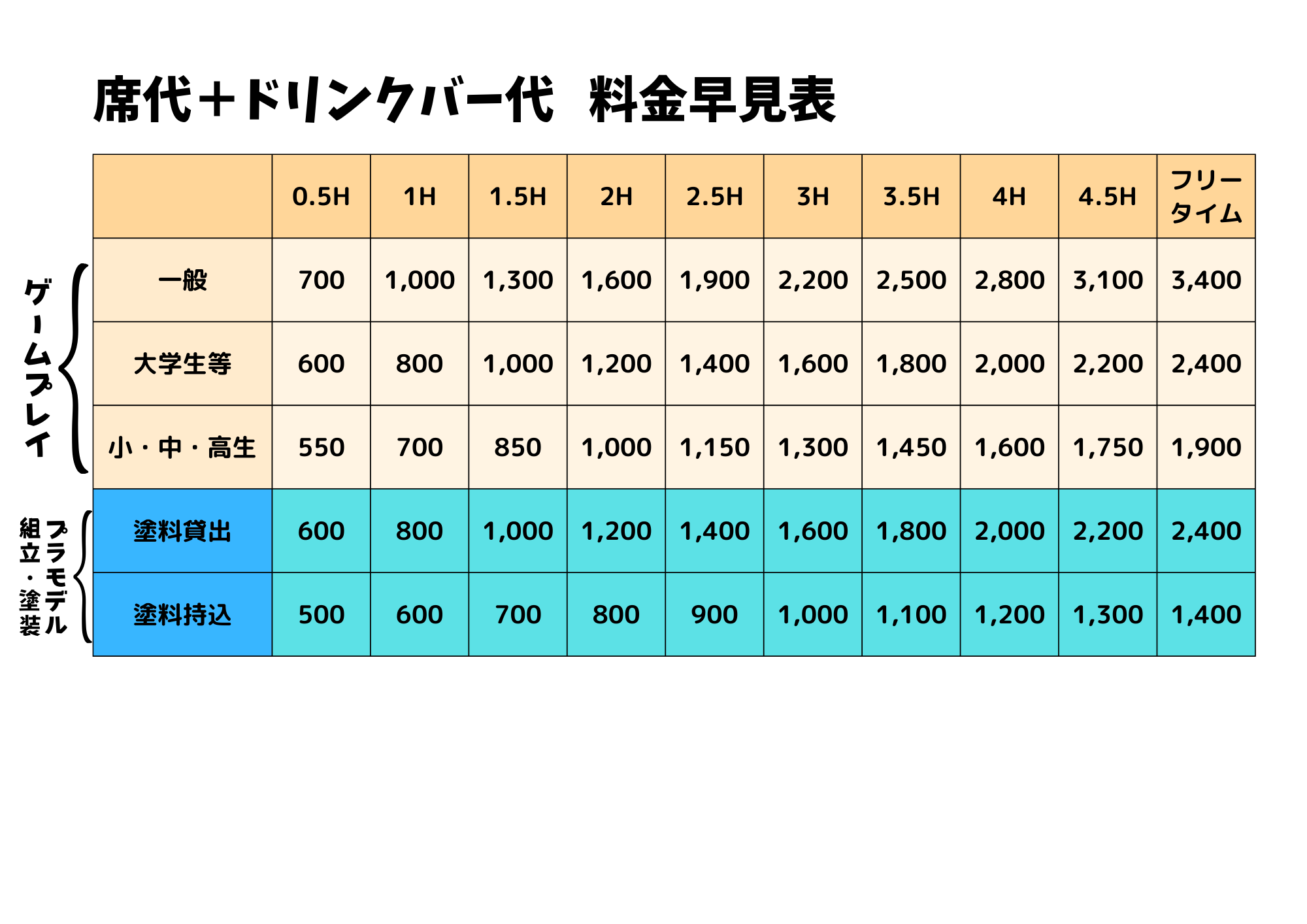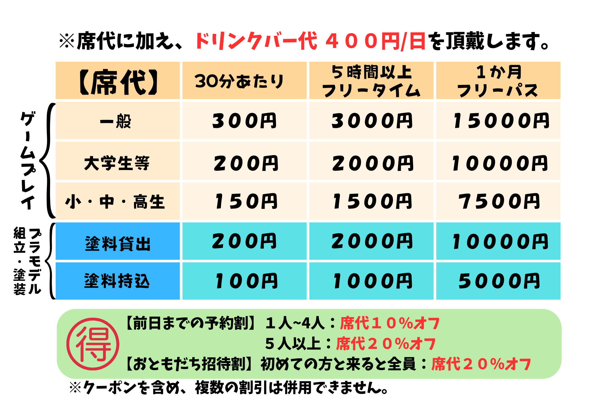一般:350円/30分、大学生:250円/30分、高校生以下:200円/30分、未就学児:無料~一般:3000円、大学生:2500円、高校生以下:2000円、未就学児:無料