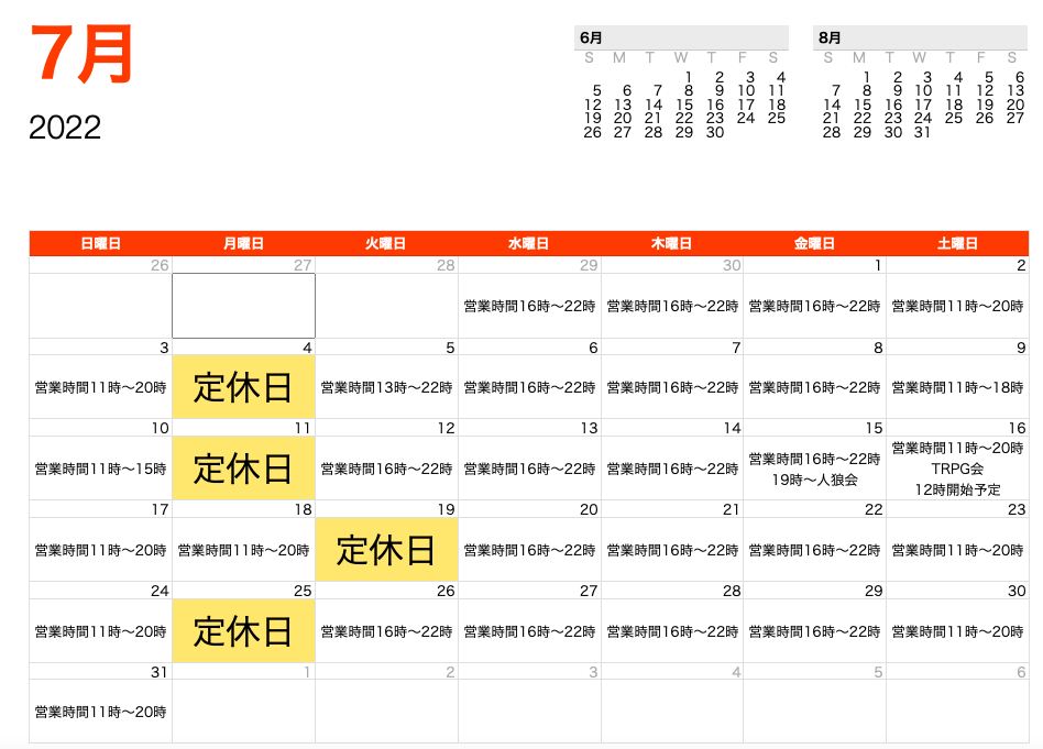 7月の定休日は変わらず